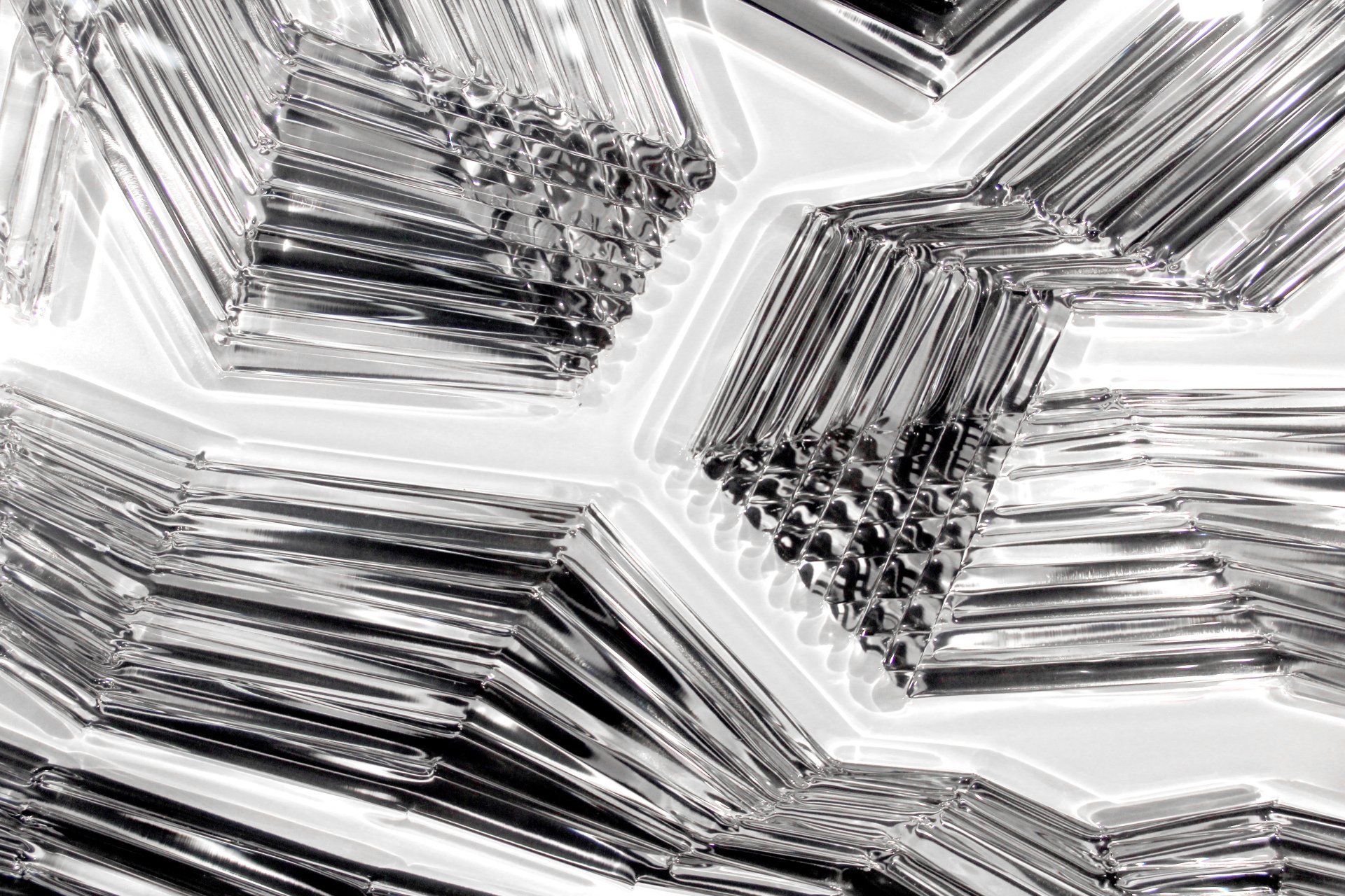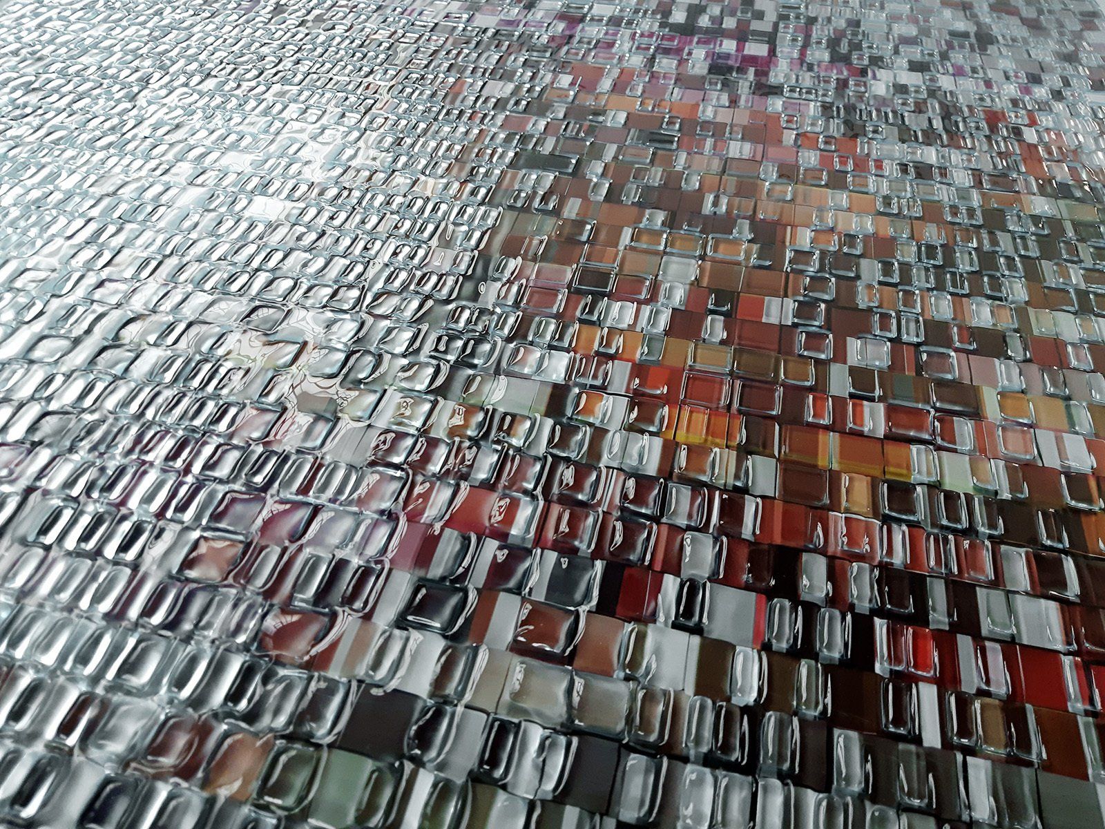 Every minimally changed line of sight or adjustment of light incidence results in new superimpositions. These create new perceptions of depth, of structures deep within the object and, thus, a different view of the photograph that the object is based upon. The interference of different layers leads to visual interferences and prismatic effects. The transparent layers establish a perceptive space with structures and patterns that seem to draw the underlying photographic image into the realm of space. The photographic image emerges and is reflected as a refraction within the imprints and, thus, becomes visible along the object surface. Retrieving the image and drawing it to the foreground is contingent upon distance. This distance becomes apparent in the relation between artwork and observer.